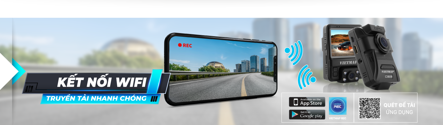 VIETMAP C63 trang bị công nghệ truyền dữ liệu thông qua kết nối WIFI không dây, giúp việc xem lại, lưu trữ chia sẻ video lên mạng xã hội dễ dàng trên các thiết bị hệ điều hành Android và IOS.
