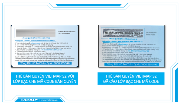 - Thẻ cào : Khách hàng sẽ được nhận được 1 thẻ cào và khi cào lớp tráng bạc thì sẽ hiển thị mã bản quyền phần mềm VIETMAP S2.