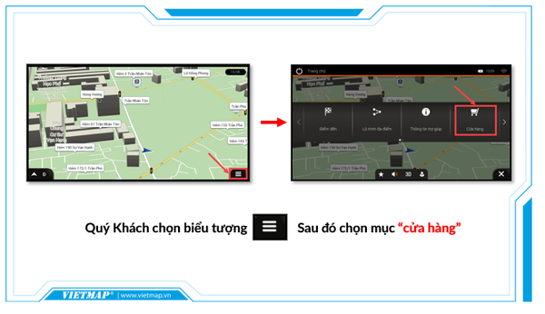 Nếu phần mềm của khách hàng có bản quyền thì mục “Cửa hàng” sẽ cho phép tải và cập nhật dữ liệu bản đồ mới nhất khi VIETMAP thông báo cập nhật bản đồ.