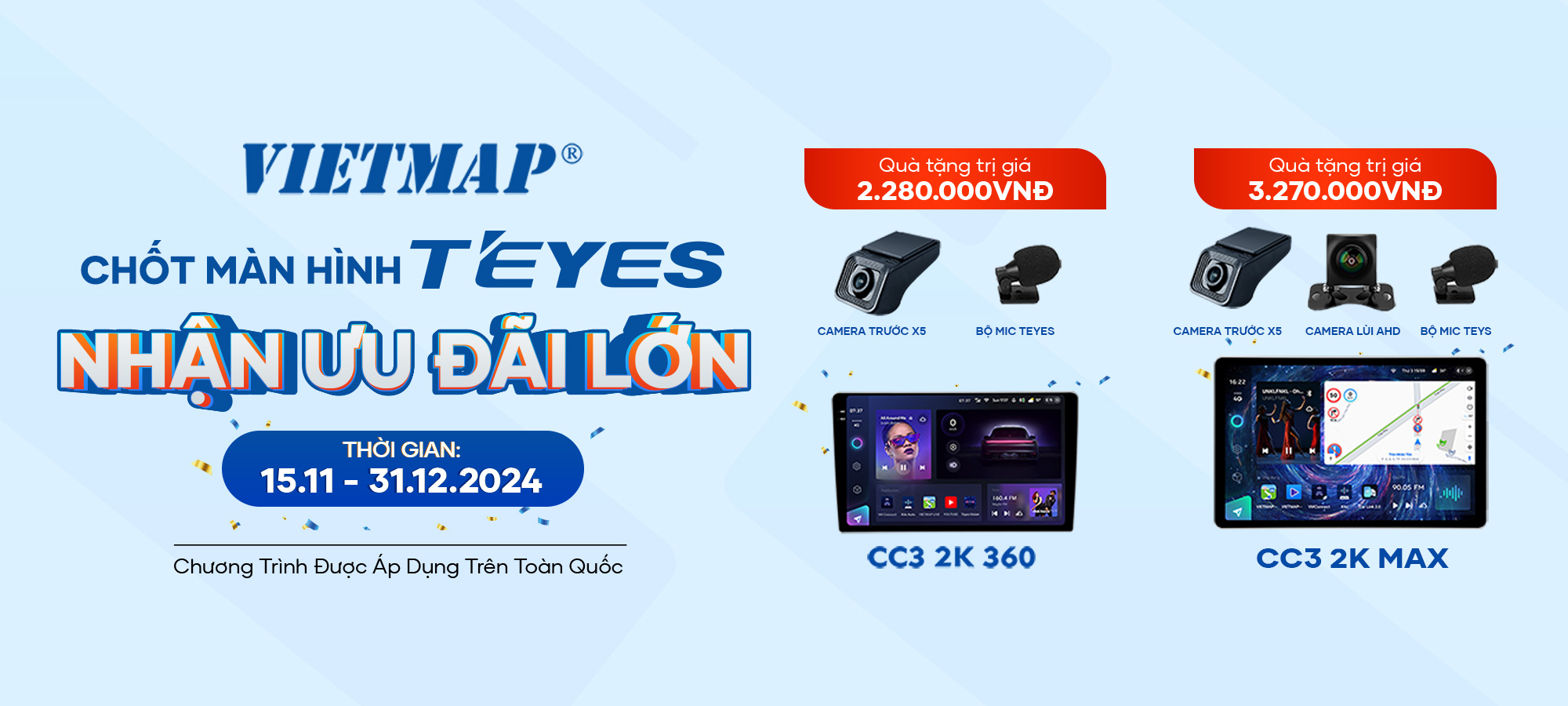 Bắt nhịp không khí mua sắm rộn ràng để chào đón năm mới, Vietmap mang đến chương trình khuyến mãi lớn nhất năm dành cho Quý Khách Hàng khi mua các sản phẩm màn hình ô tô Teyes từ ngày 15.11.2024.