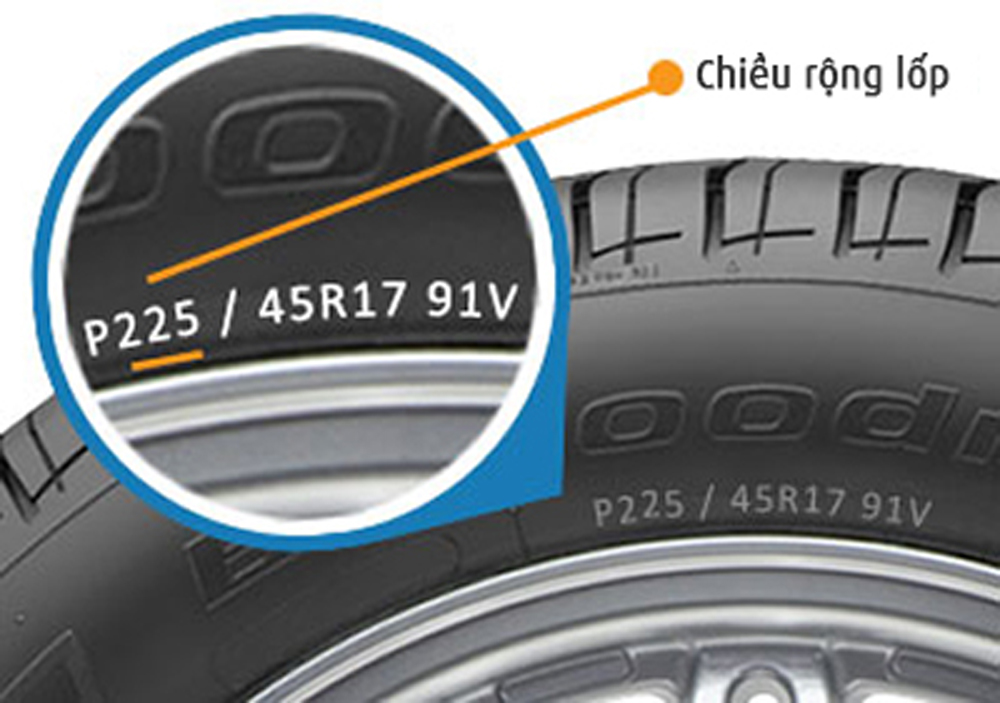 Chẳng hạn như P 225/45R17 91V thì lốp có chiều rộng là 225 mm. Ngoài ra, đơn vị đo chiều rộng lớp có thể là inch, chẳng hạn như P225 tương ứng với chiều rộng là 8,86 inch.