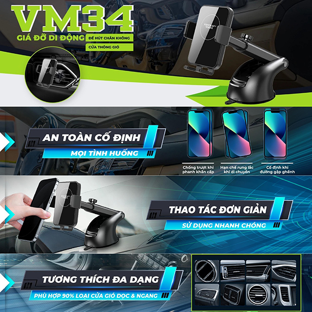 Đây là loại giá đỡ di động đế hút chân không chất lượng và đáng mua nhất hiện nay. Với thiết kế thời trang, thoải mái kéo giãn cùng khả năng tương thích với các loại màn hình điện thoại lớn, VIETMAP VM33 phù hợp sử dụng cho nhiều đời smartphone khác nhau.