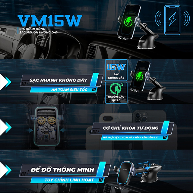 VIETMAP VM15W là sản phẩm kẹp điện thoại trên ô tô có hỗ trợ tính năng sạc nhanh không dây.