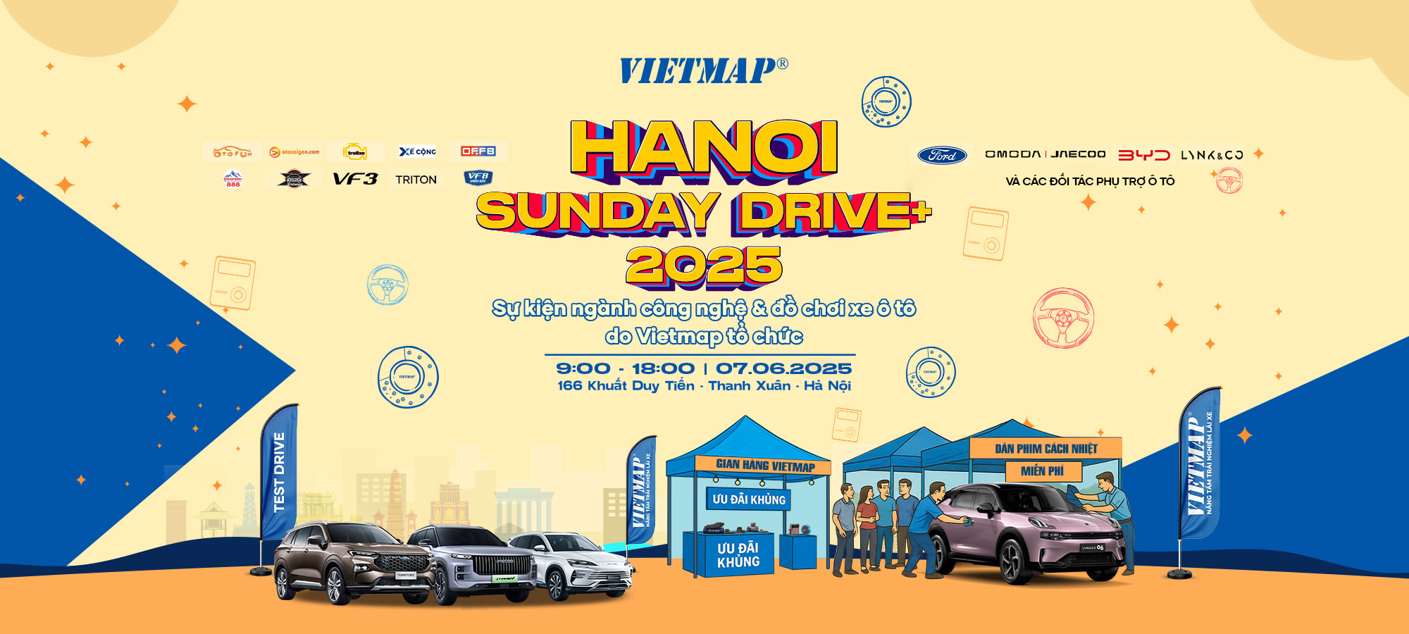 “Hanoi Sunday Drive+ 2025” do Vietmap tổ chức sẽ diễn ra ngày 07.06.2025 tại Hà Nội. Sự kiện quy tụ các thương hiệu ô tô lớn, đối tác ngành phụ kiện xe và cộng đồng người dùng yêu thích công nghệ với nhiều hoạt động trải nghiệm và ưu đãi mua sắm.