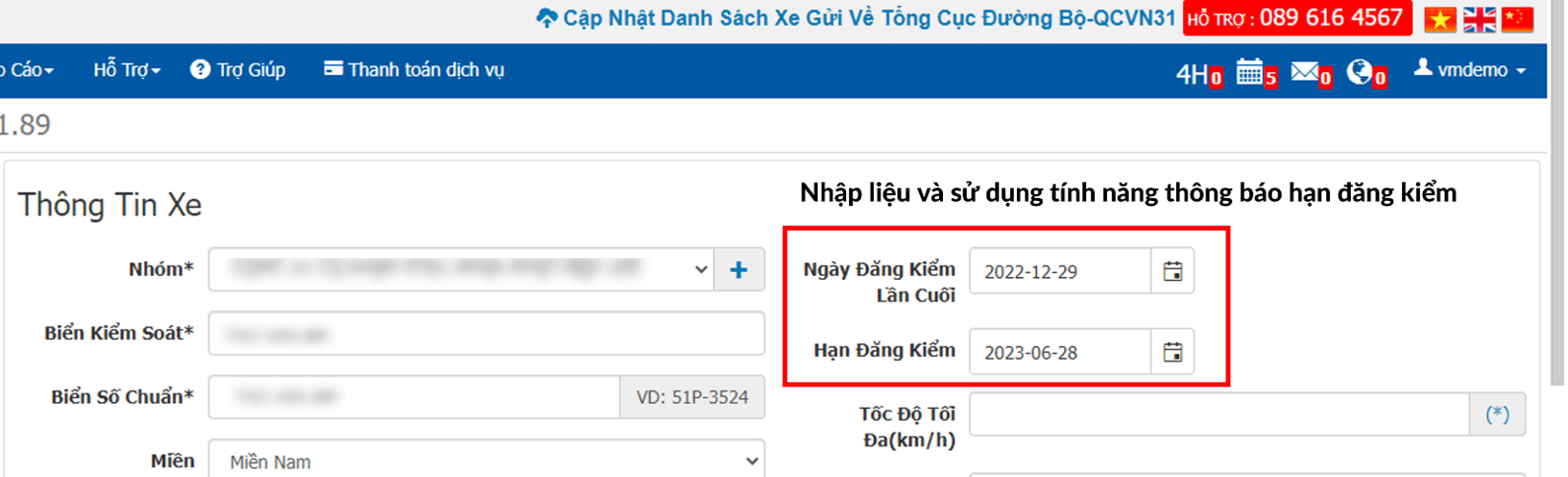 Bước 4: Nhập liệu và sử dụng tính năng thông báo hạn đăng kiểm, để hệ thống lần sau sẽ tự động nhắc nhở kiểm tra: Vào thẻ Quản Lý -> Danh Sách xe -> chọn biển số xe.