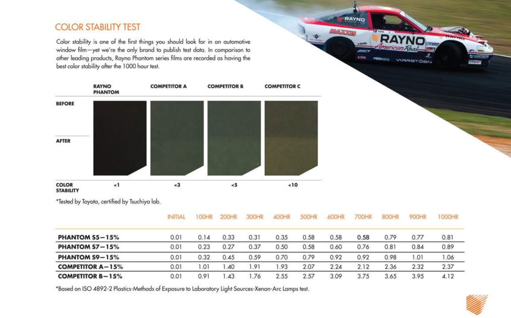Công thức sản xuất độc quyền của Rayno làm giảm kích thước của các hạt carbon xuống quy mô nano, ngăn ngừa sương mù và ánh sáng chói từ màng carbon thông thường trong khi vẫn duy trì độ bền đáng kinh ngạc. Hơn nữa, bằng cách đưa vào các hạt gốm có độ tinh khiết cao, Rayno đã nâng cao hơn nữa độ ổn định màu của gốm trong khi vẫn duy trì tầm nhìn tốt nhất. Dòng phim Phantom của Rayno là sản phẩm được cải tiến không ngừng với tầm nhìn và độ bền ổn định theo năm tháng, độ ổn định màu sắc và khả năng tản nhiệt cao hơn so với tất cả các loại phim cách nhiệt ô tô và phim kim loại khác trên thị trường.