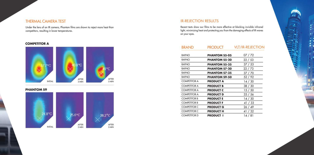 Thử nghiệm cản nhiệt cho thấy phim Rayno cản nhiệt nhiều hơn so với một loại phim khác, kết quả là nhiệt độ giảm xuống. Bên cạnh đó, thử nghiệm cũng thể hiện rằng phim Rayno cản tia hồng ngoại, bảo vệ người trong xe khỏi những tác hại liên quan đến sức khỏe.