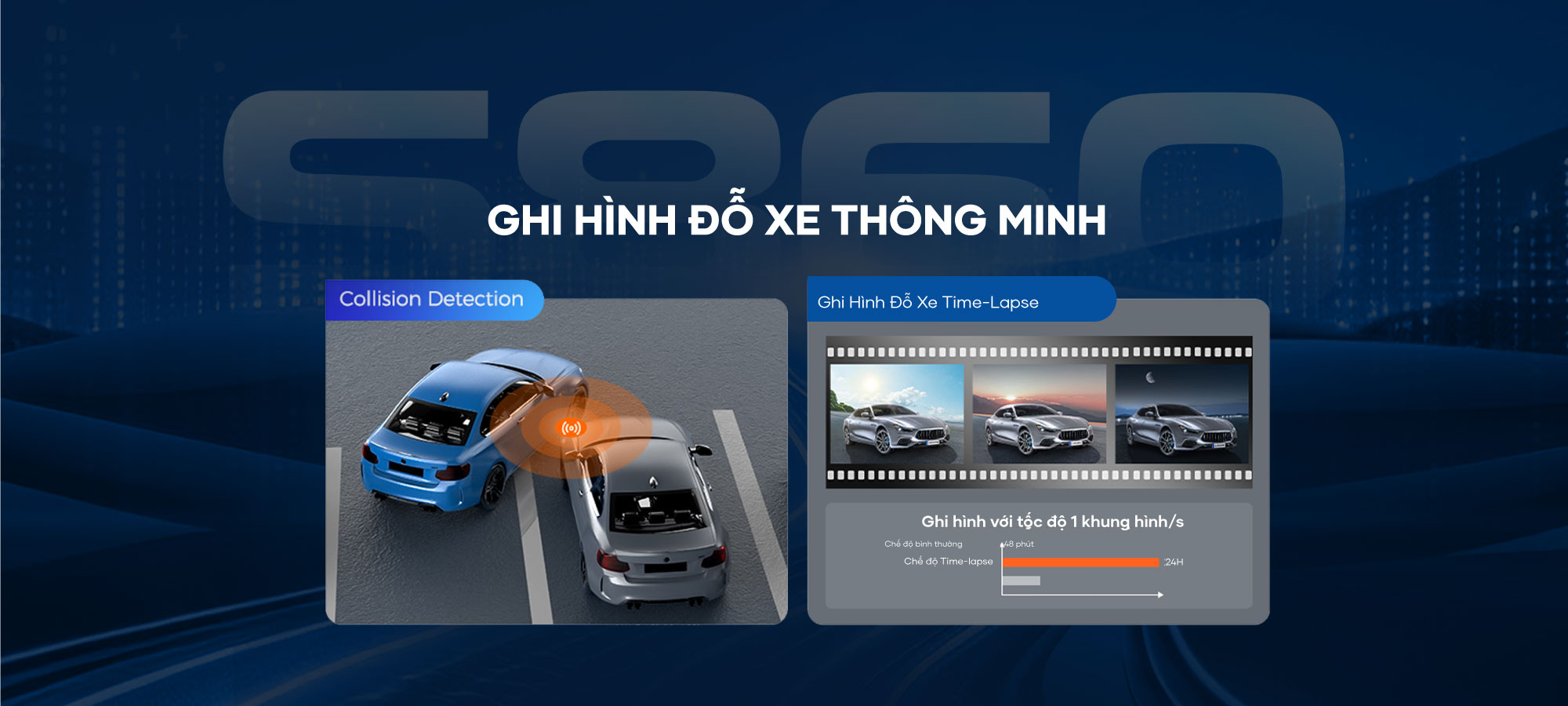 Ghi hình đỗ xe Time-lapse: là chế độ ghi hình đỗ xe tua nhanh, liên tục với tốc độ 30 khung hình/ giây và nén video 30 phút thông thường chỉ còn 1 phút, vừa tiết kiệm dung lượng thẻ nhớ vừa hỗ trợ người dùng xem lại đầy đủ nhất có thể các tình huống xảy ra xung quanh xe một cách chân thực và rõ nét khi chủ xe vắng mặt.