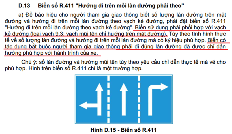 Theo đó, biển báo R.411 có ý nghĩa là: chỉ dẫn cho tài xế biết số lượng làn đường và hướng đi trên mỗi làn đường theo vạch kẻ đường - bắt buộc người điều khiển phương tiện phải đi đúng làn đường được chỉ dẫn hướng phù hợp với hành trình của xe.