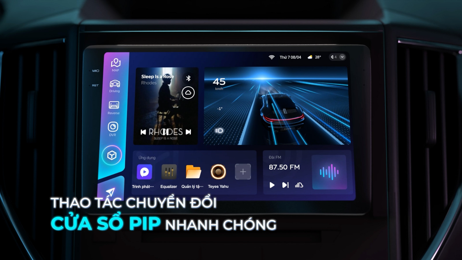 Picture-in-Picture (PiP) là cửa sổ ứng dụng thu nhỏ, hiển thị ở góc bên phải màn hình ô tô TEYES CC3 2K 360. Giao diện PiP được thiết kế tinh giảm và tối ưu nhưng vẫn đảm bảo khả năng hiển thị đầy đủ các thông tin quan trọng dành cho bác tài Việt.
