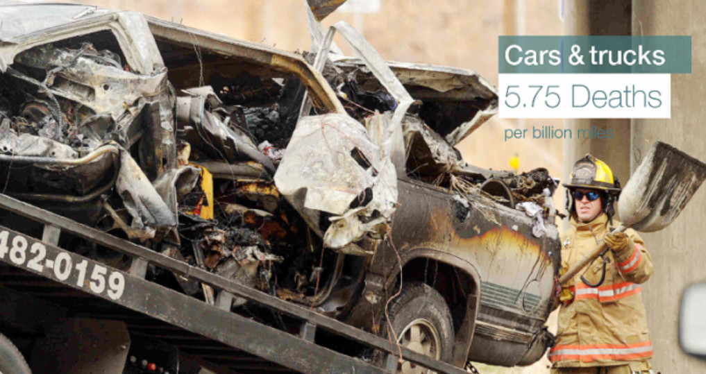 Trong giai đoạn từ năm 2008 - 2013, hơn 113.000 người đã tử vong khi sử dụng ô tô hoặc xe tải để tham gia giao thông (khoảng 5.75 người chết/1.6 tỷ km). Lý do là vì hầu hết người dân ở Mỹ đều dùng phương tiện này để di chuyển.