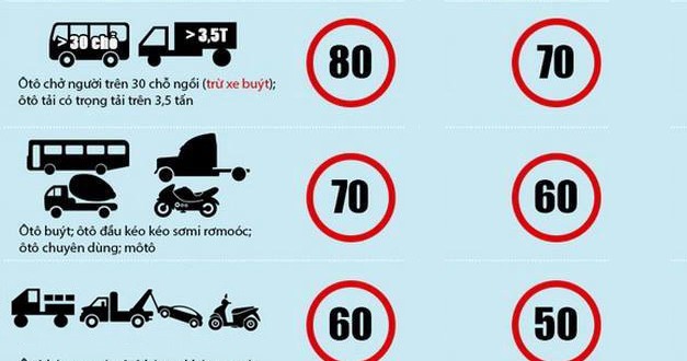 - Đối với xe ô tô trên 30 chỗ (trừ xe bus), ô tô có tải trọng > 3,5 tấn Tốc độ tối đa cho phép trên đường đôi hoặc đoạn đường 1 chiều nhưng có nhiều làn xe là 80 km/h, tốc độ tối đa tại đường một chiều có 1 làn xe hoặc đường 2 chiều nhưng không có dải phân cách sẽ là 70 km/h.