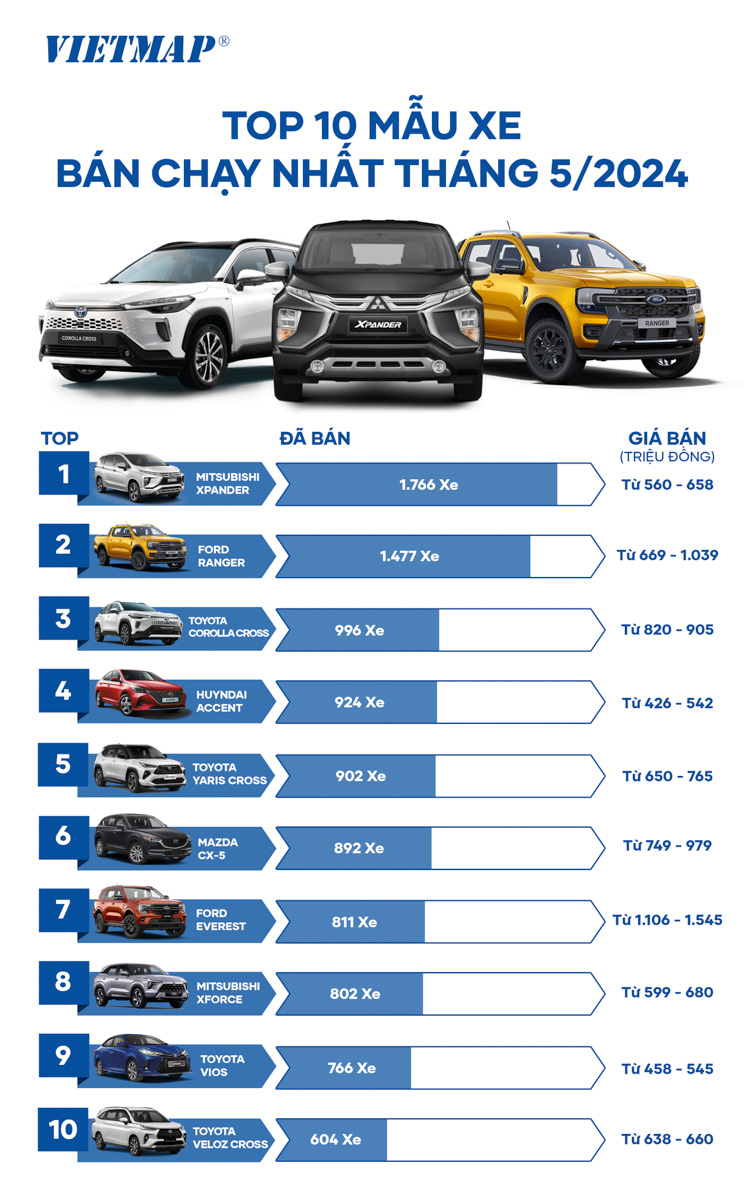Một cái tên đáng chú ý trong doanh số tháng 5 là Toyota Corolla Cross khi mẫu xe này có lượng tiêu thụ 996 xe, trở thành mẫu xe bán tốt thứ ba toàn thị trường, chỉ xếp sau Mitsubishi Xpander và Ford Ranger. Lý cho cho sức bật này có thể đến từ việc ra mắt thế hệ mới cùng khoảng giá 820-905 triệu đồng dễ chịu hơn so với thế hệ cũ. Một bất ngờ nữa là Toyota Veloz Cross cũng lọt vào top 10 xe bán chạy nhất Việt Nam trong tháng 5. Mẫu MPV này có doanh số 601 xe.
