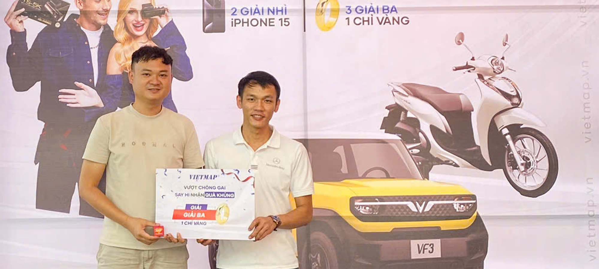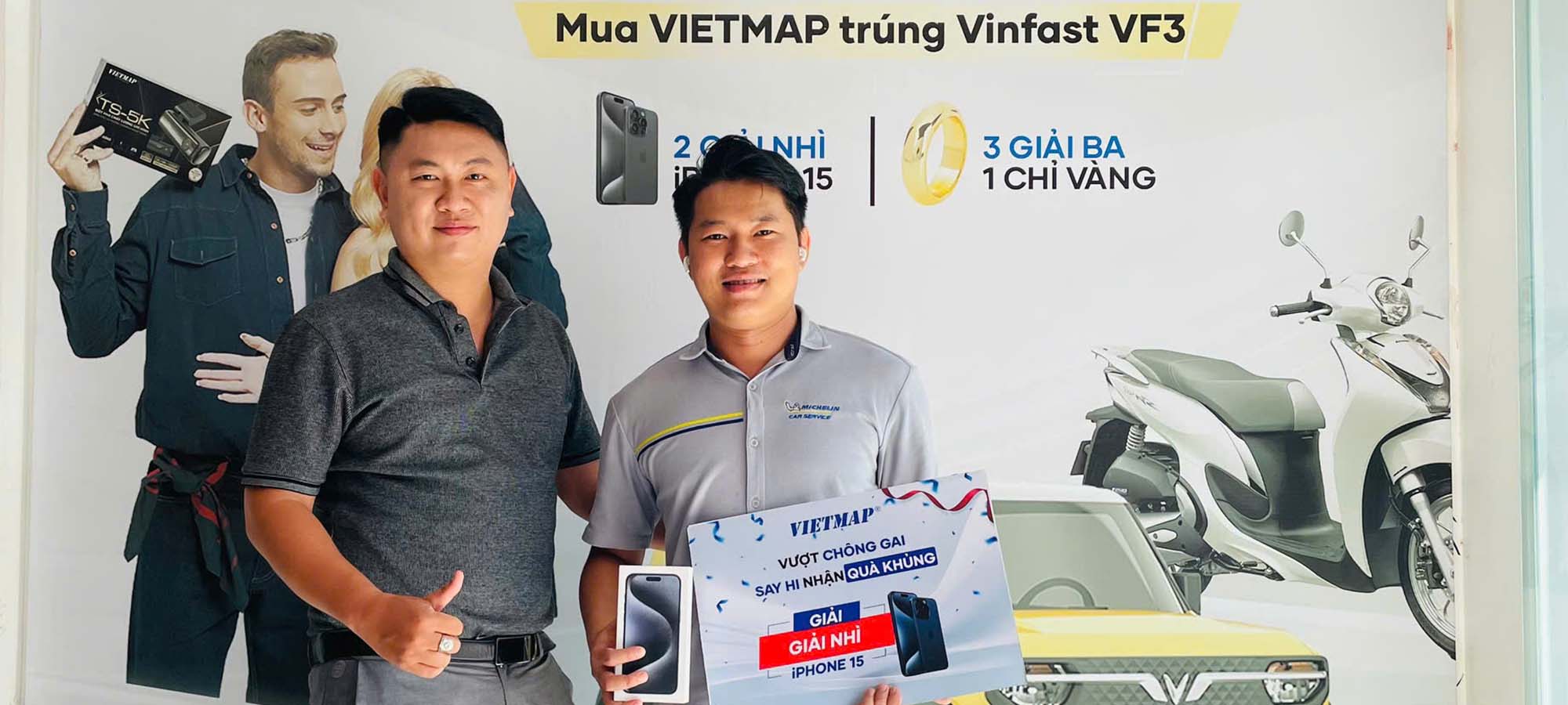Vietmap trao Iphone 15 cho 2 khách hàng trúng giải nhì – anh Phạm Trần Hoàng và anh Chu Văn Diện.