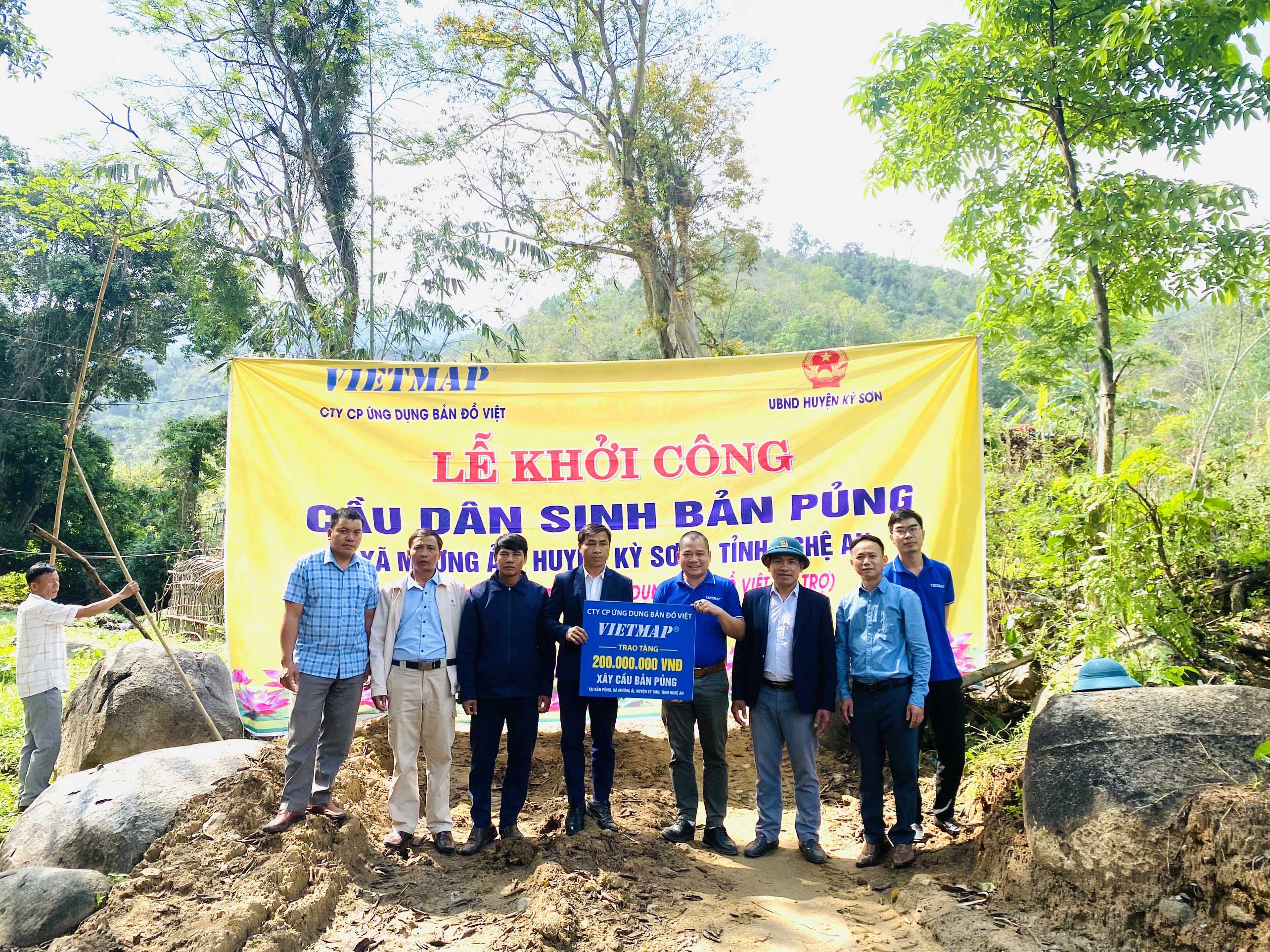 Ngày 01/04 vừa qua, VIETMAP đã phối hợp với huyện Kỳ Sơn (Nghệ An) tổ chức khởi công xây dựng công trình cầu dân sinh tại bản Pủng, xã Mường Ải. Bản Pủng cách trung tâm thị trấn Mường Xén huyện Kỳ Sơn 47 km. Toàn bản có 125 hộ, 633 khẩu, chủ yếu là dân tộc Thái.