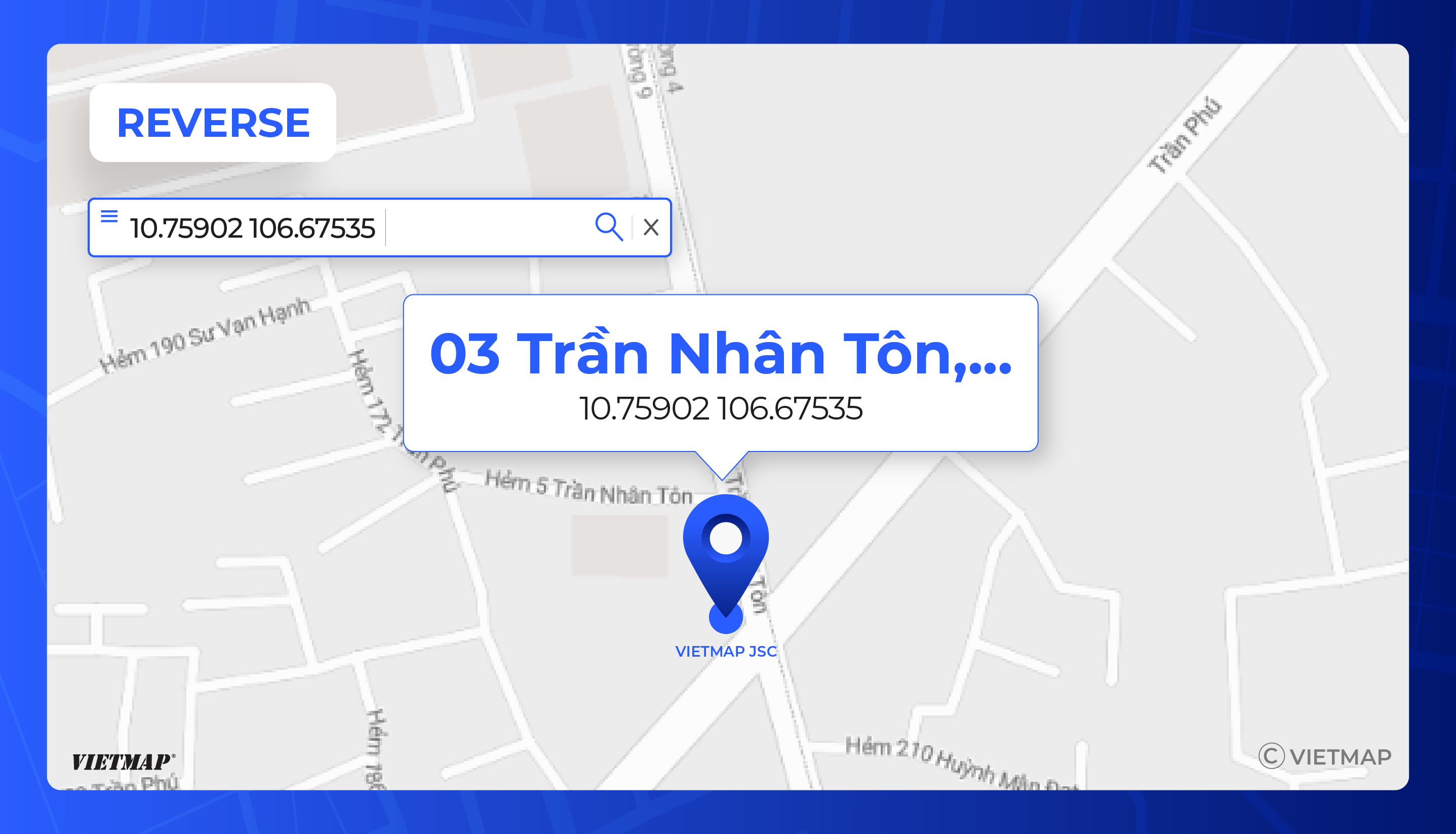 API Reverse là dịch vụ cho phép tìm kiếm, xác định một địa chỉ hay địa điểm dựa trên một tọa độ địa lý (kinh độ, vĩ độ) trên bản đồ (ngược lại với cách hoạt động của API Geocoding). API Reverse cũng được các doanh nghiệp ứng dụng khi cần đến chức năng xác định địa chỉ, địa điểm của các đối tượng trên bản đồ như: Vị trí nhân viên, vị trí khách hàng, vị trí tài sản, vị trí cửa hàng, vị trí nhà hàng, vị trí khách sạn... Cùng với API Geocoding, API Reverse cũng là tiền đề cung cấp thông tin đầu vào cho các chức năng khác của ứng dụng như: Tìm đường, Dẫn đường,...