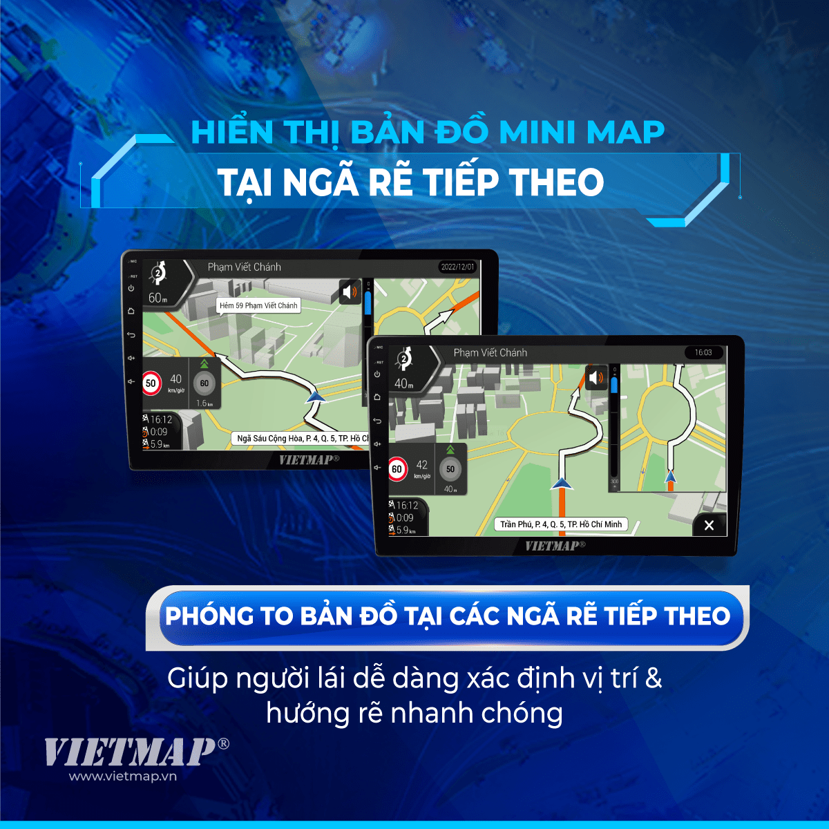 Phóng to bản đồ tại các ngã rẽ tiếp theo giúp người lái dễ dàng xác định vị trí & hướng rẽ nhanh chóng.