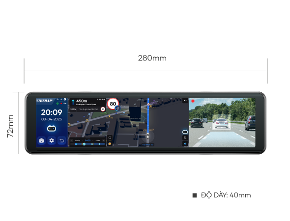 VIETMAP V740 sở hữu màn hình gương IPS kích thước 11.26 inch, thiết kế tràn viền, kết hợp lớp phủ chống chói giúp hiển thị sắc nét trong nhiều điều kiện ánh sáng.