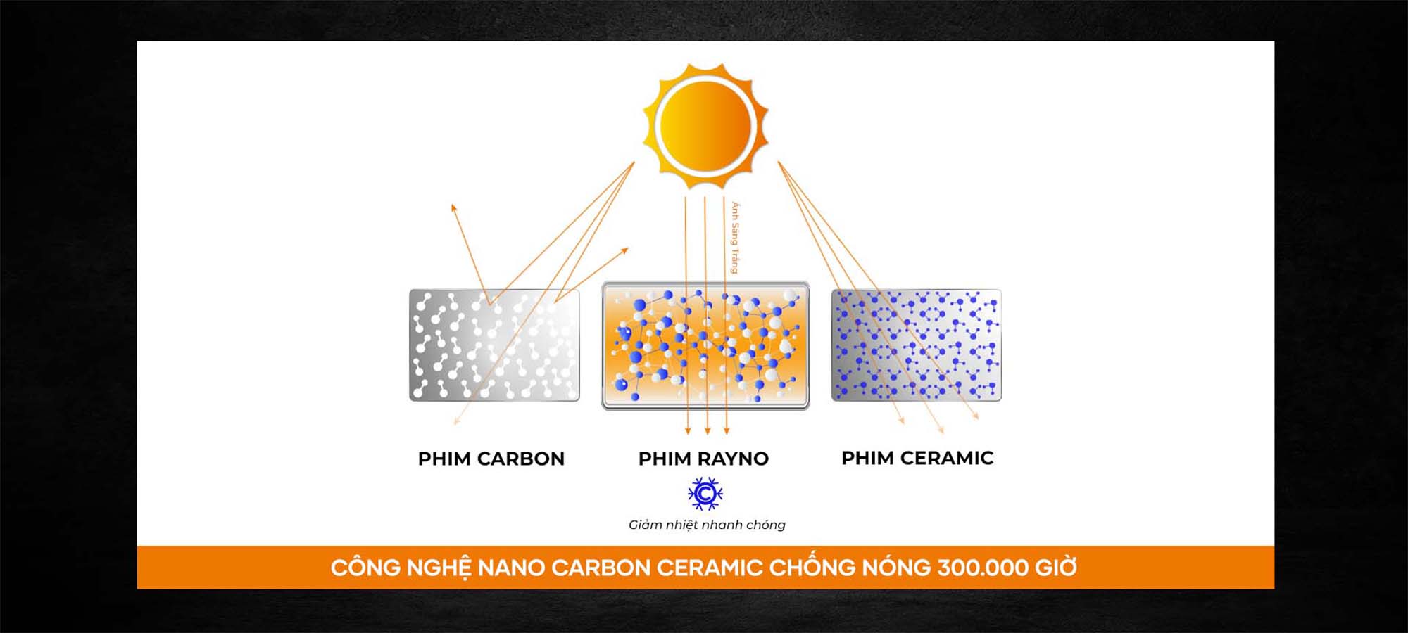 Trải qua quá trình nghiên cứu, thử nghiệm và ứng dụng, đến nay RAYNO là thương hiệu đầu tiên trên thế giới vinh dự nhận bằng sáng chế công nghệ Nano Carbon Ceramic. Công nghệ độc quyền này kết hợp ưu điểm của hạt nano carbon giúp ổn định màu sắc của phim cách nhiệt mà không làm ảnh hưởng đến tầm nhìn khi lái xe, và các hạt gốm dạng phân tử nano siêu nhỏ tăng liên kết bền vững, giúp phim cách nhiệt RAYNO - Chống nóng 300.000 giờ có độ bền vượt trội cùng khả năng tản nhiệt hiệu quả.