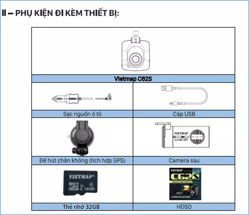 | Phụ kiện kèm theo | - Máy VietMap C62s - Camera sau C62s - Giá đỡ chân không - Sạc nguồn ô tô - Thẻ nhớ 32gb Class 10 - Sách HDSD |